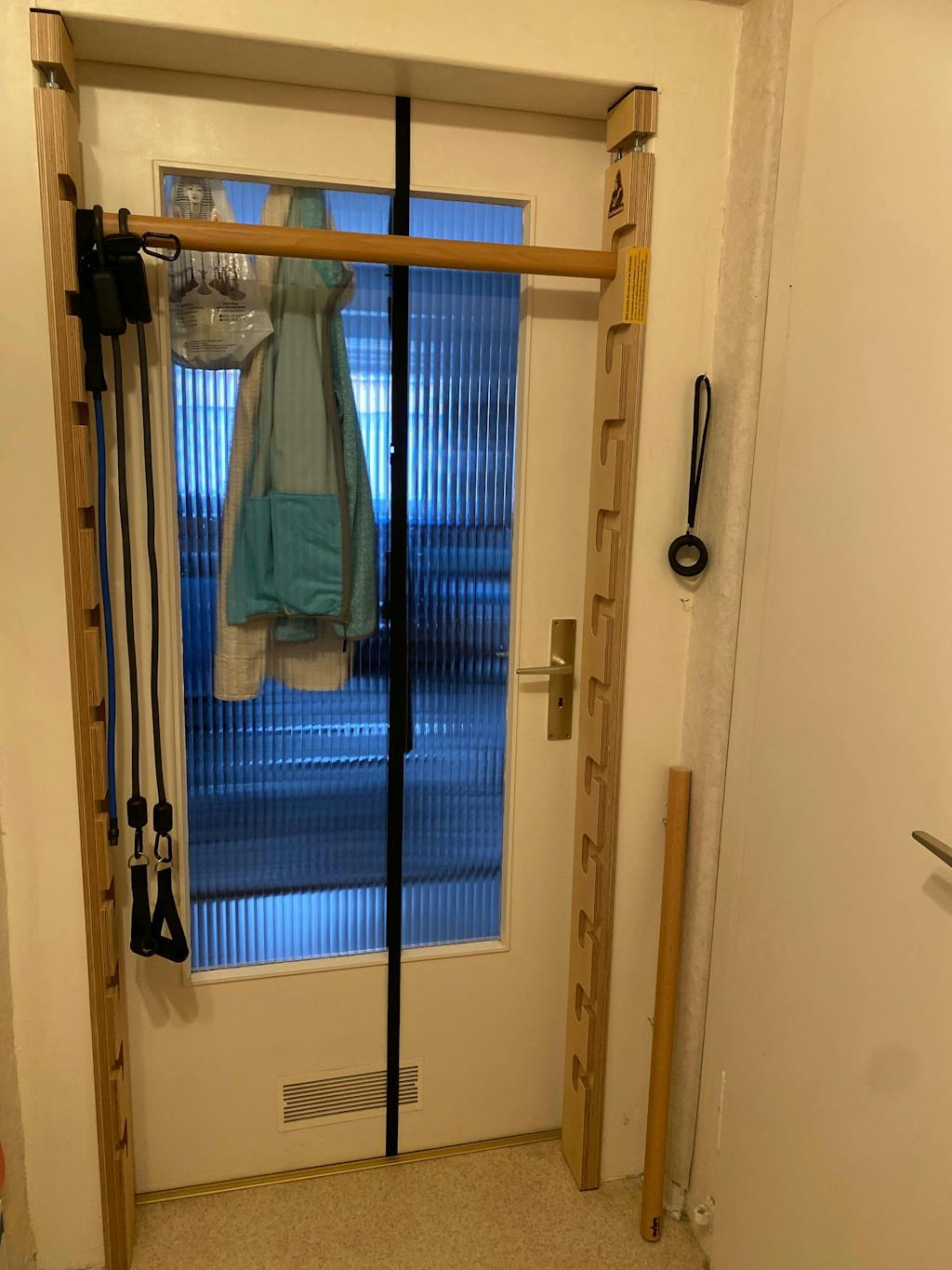 Ein kleiner Hinweis noch: Die Seitenteile der Sprossenwand stehen dann etwas aus dem Türrahmen hervor. Schau am besten nochmal, ob es eventuell Probleme mit deiner Türklinke geben könnte. Der Abstand zwischen Türklinke und Türrahmen sollte 3,2 cm betragen.