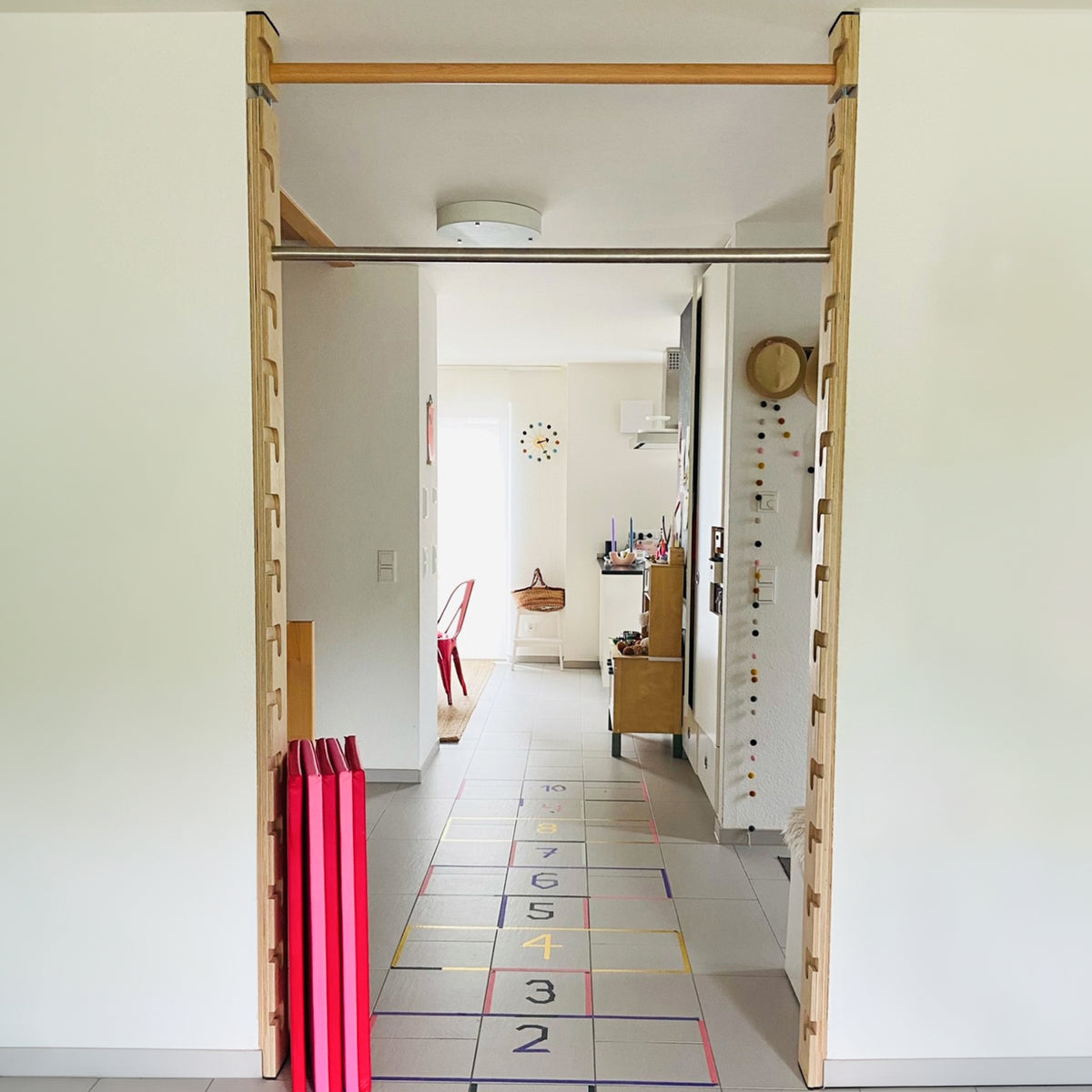 Ein kleiner Hinweis noch: Die Seitenteile der Sprossenwand stehen dann etwas aus dem Türrahmen hervor. Schau am besten nochmal, ob es eventuell Probleme mit deiner Türklinke geben könnte. Der Abstand zwischen Türklinke und Türrahmen sollte 3,2 cm betragen.